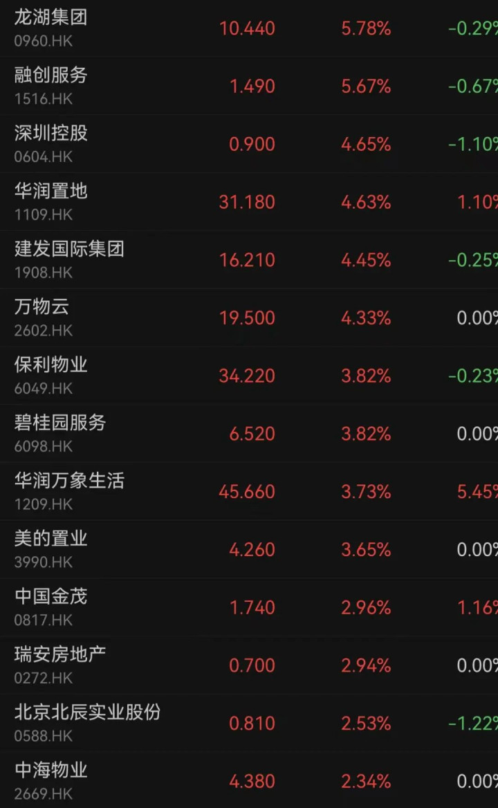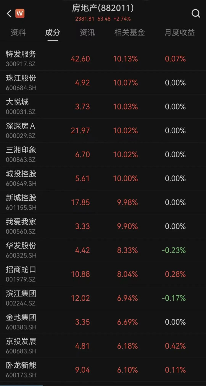 受此消息影响,A股房地产板块也迎来显著回暖。截至发稿,A股房地产板块涨幅超2.7%,包括珠江股份(SH600684)、大悦城(SZ000031)、深深房A(SZ000029)等个股涨停。