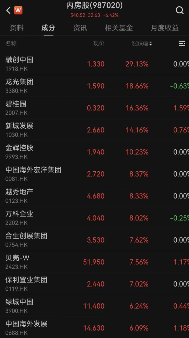 内房股也集体大涨。